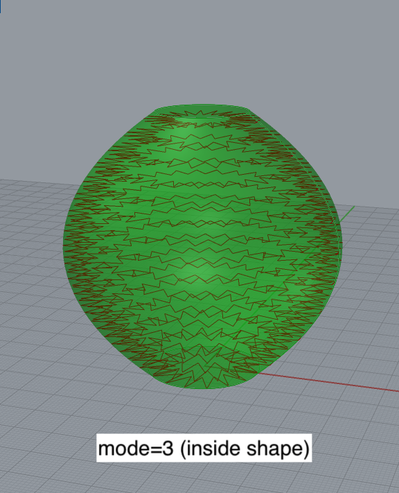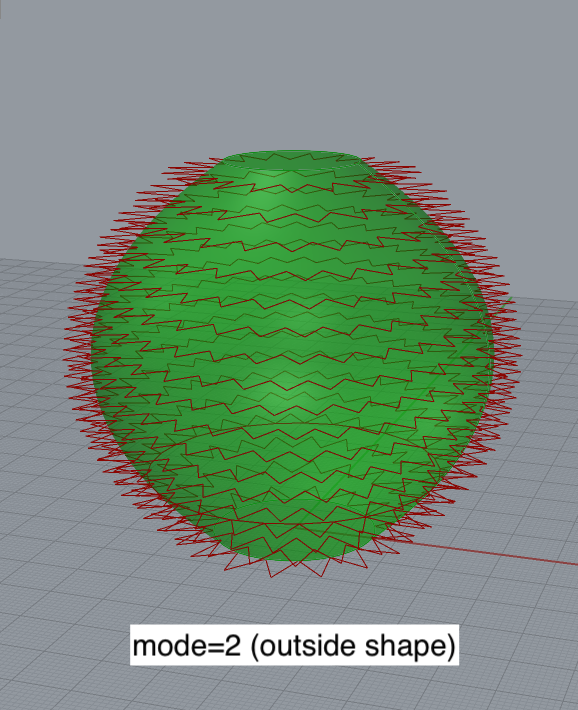 mode (optional): determines where the path oscillates, relative to the input surface. mode=1 (default): path is on the surface. mode=2: path is offset to the outside of the surface. mode=3: path is offset to the inside of the surface. Default value: 1 (on surface).